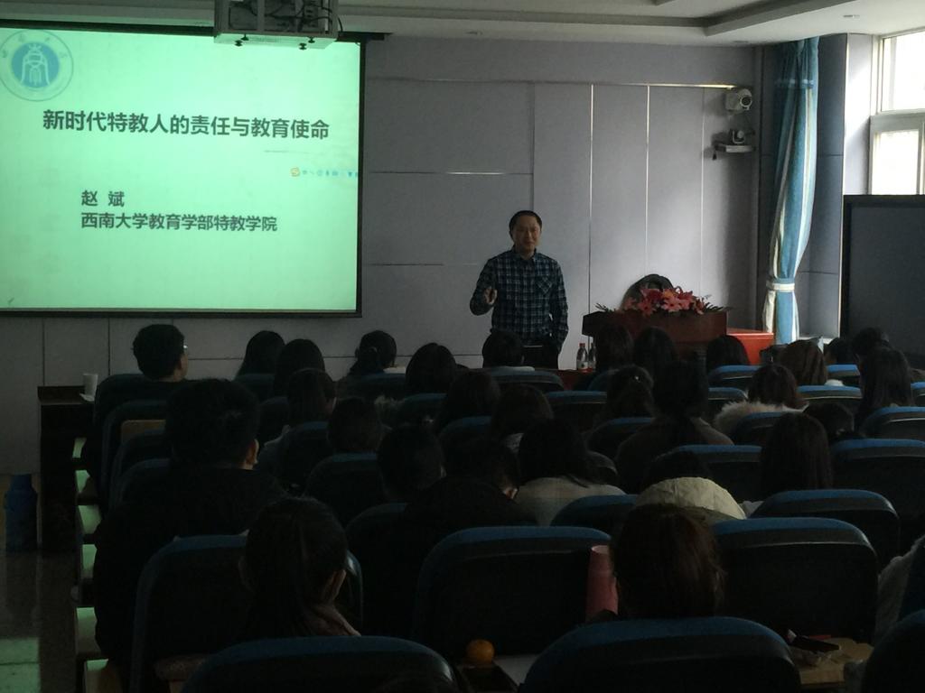 2018年11月27日下午,教育部高等公司特殊教育教师培养教学指导委员会委员、西南大学特殊tyc122cc太阳成经理赵斌教授莅临公司,开展主题为“新时代特教人的责任与使命”的专题讲座,讲座由特殊教育教研室主任隋春玲老师主持,特教专业120位师生聆听了此次讲座。