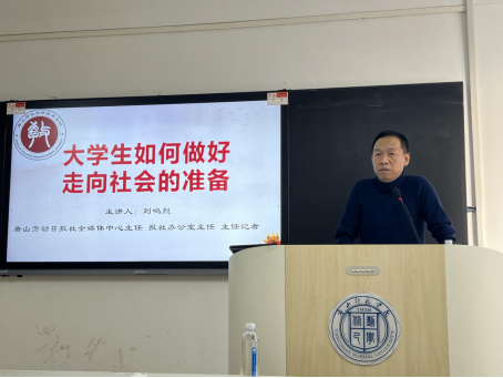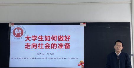 为提高毕业生的就业能力,为进入职场做好准备,2021年12月2日,tyc122cc太阳成邀请唐山劳动日报社全媒体中心主任、唐山劳动日报社办公室主任、主任记者刘鸣烈为毕业班同学做了主题为《老员工如何做好走向社会的准备》的专题讲座。