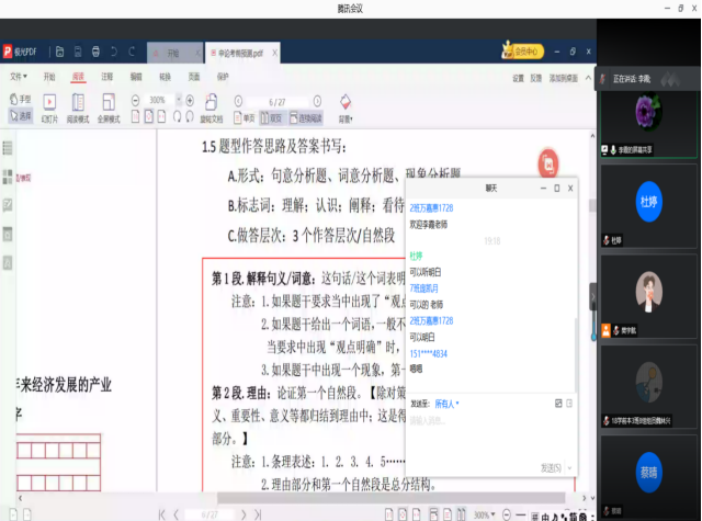 讲座上李霞教授开门见山,从题型预测开始,重点强调如何准确快速的抓住各题块得分点,向同学们介绍了对策题的解题技巧,涵盖了分值预测、答案条数、题型难点、题型作答思路及答案书写等多方面。然后李霞教授就答案条数的要求与技巧,以及注意事项都进行了细致的讲解。她还以同学们手中的公务员考试真题为例,结合材料和问题,进行答题指导和答案要点分析,就如何做出合理性论断、如何结合材料多角度分析问题、如何运用材料内容做好题、点出要点得高分等技巧都做了具体的示范,同学们通过弹幕、连麦等方式与李霞教授积极互动,反响十分热烈。