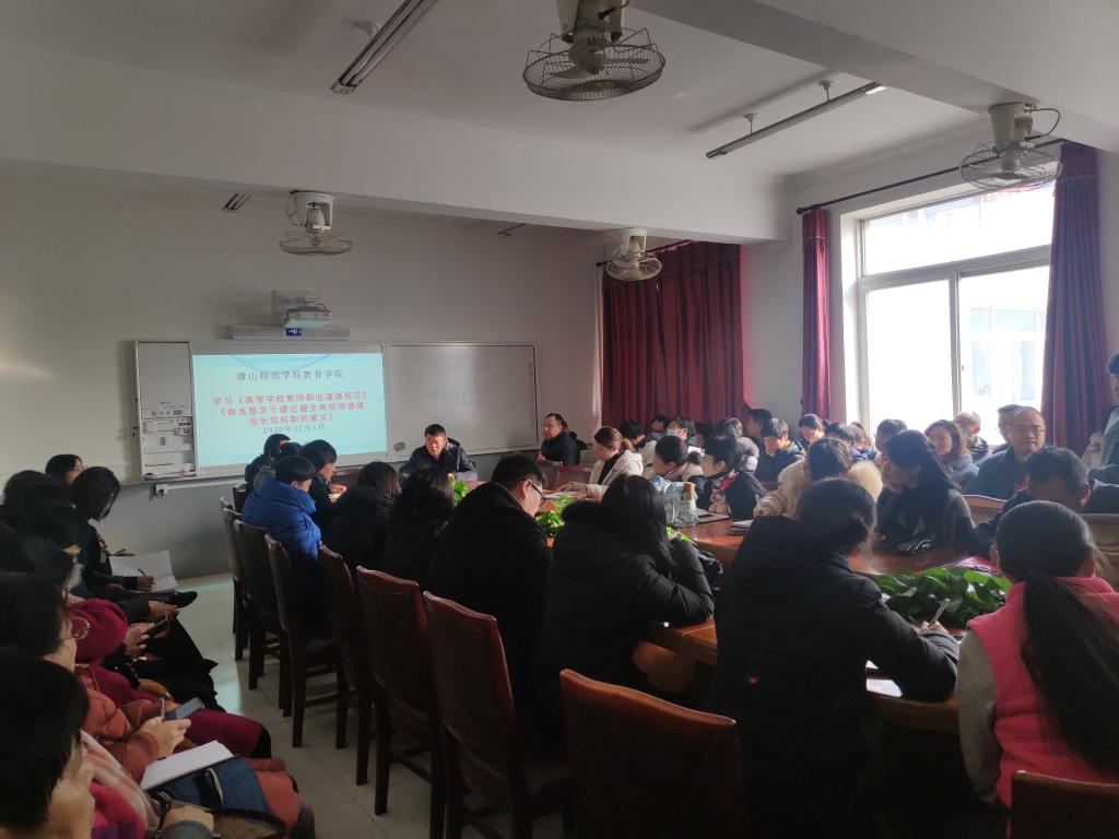为深入贯彻习近平新时代中国特色社会主义思想和党的十九大精神,进一步加强师德师风建设,2020年12月1日,tyc122cc太阳成全体教职工开展了《高校公司教师职业道德规范》《教育部关于建立健全高校师德建设长效机制的意见》,争做“新时代好老师”的专题学习。