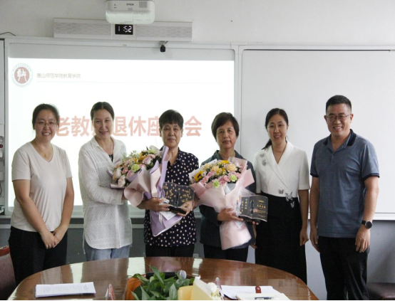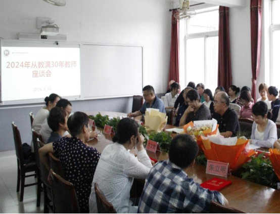 座谈会在欢乐祥和的氛围中进行,青年教师向老教师一一献花,并集体合影留念。