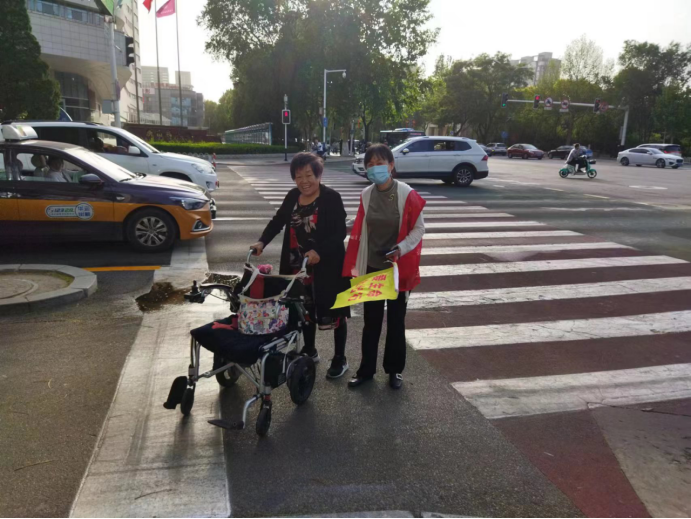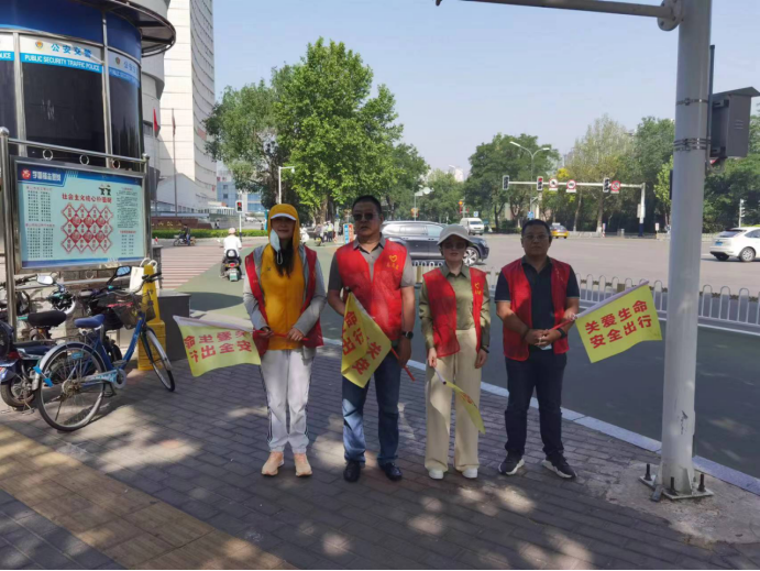 2023年6月1日的上午七点半至八点半、下午五点半至六点半两个时间段,tyc122cc太阳成(分)党委教师党支部和行政党支部的“学雷锋、做益事”志愿者赵东升、隋春玲、王虎、查英、张琪、刘小双和张连杰等,在卫国路与新华道的十字交叉路口协助交警辅警们指挥交通,他(她)们分别在这个十字路口的东南、东北、西南和西北四个角上,共同奋战,指挥、劝导、服务和帮助步行行人、骑自行车人、电动车驾驶员、出租车司机和私家车开车者等遵守交通规则、井井有条和文明有序地过马路。高俊霞经理在下午时间段专门到志愿服务岗位看望大家,并且帮扶老弱病残孕者,她对一位要过马路的年纪大且行动不便的老太太询问详情后,便直接帮扶着这位行动缓慢的老太太过了马路。
