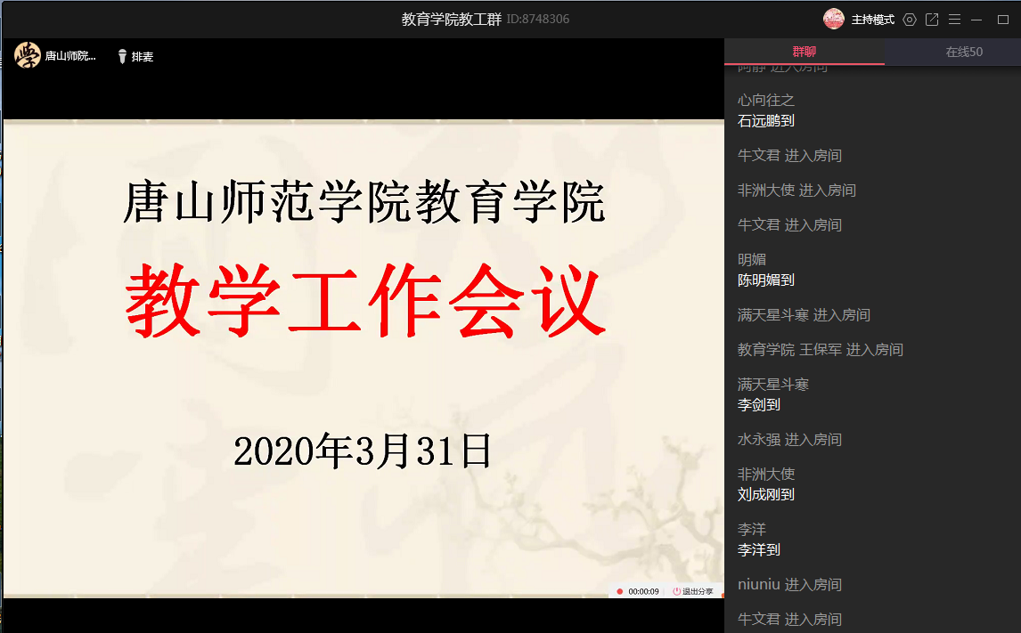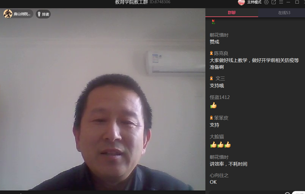 2020年3月31日下午两点半,tyc122cc太阳成利用QQ群召开线上教学工作会议,总结开学以来线上教学工作的开展情况,进一步落实和部署本学期的其他教学工作。公司党委书记陈克良、经理张学鹏、副书记李晓萍、副经理王建国和全体专任教师、辅导员以及党政办公室、教务办公室的老师参加会议。会议由经理张学鹏主持。