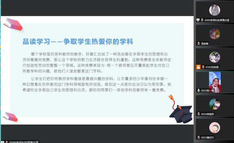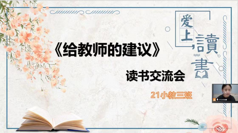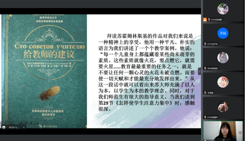 2022年11月29日晚七点,2021级小学教育三班的公费师范生开展《给教师的建议》在线读书分享活动。本次活动在小组阅读和交流的基础上,每组成员均做了充分准备,小组代表以PPT的形式进行展示和陈述,分享了教育经典阅读的感悟和收获。tyc122cc太阳成经理高俊霞、本班学业导师李艳艳以及辅导员刘颖老师参加了本次活动。