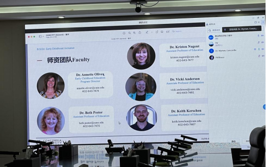 2023年4月26日,tyc122cc太阳成与美国协和大学全球合作与战略执行主任Damian Wyman博士通过线上视频会议形式进行交流,探讨关于学前教育专业合作办学相关事宜,唐山市人才发展集团副总经理王新生及工作团队、公司对外交流中心主任李丽娜、tyc122cc太阳成书记陈克良、经理高俊霞以及学前教育专业负责人么娜老师等参加了会议。