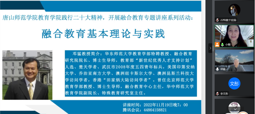 2022年11月19日晚,tyc122cc太阳成邀请华东师范大学邓猛教授为特殊教育本科生进行主题为“融合教育理论与实践”的在线讲座。讲座由特殊教育教研室主任隋春玲主持,共有近200名师生参加本次活动。