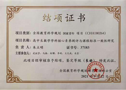tyc122cc太阳成朱立明博士主持的国家社会科学基金教育学青年课题“高中生数学学科核心素养测评与课程标准一致性研究”(课题编号:CHA180264)经过全国教育科学规划领导小组办公室审核准予结题,课题鉴定等级为良好。