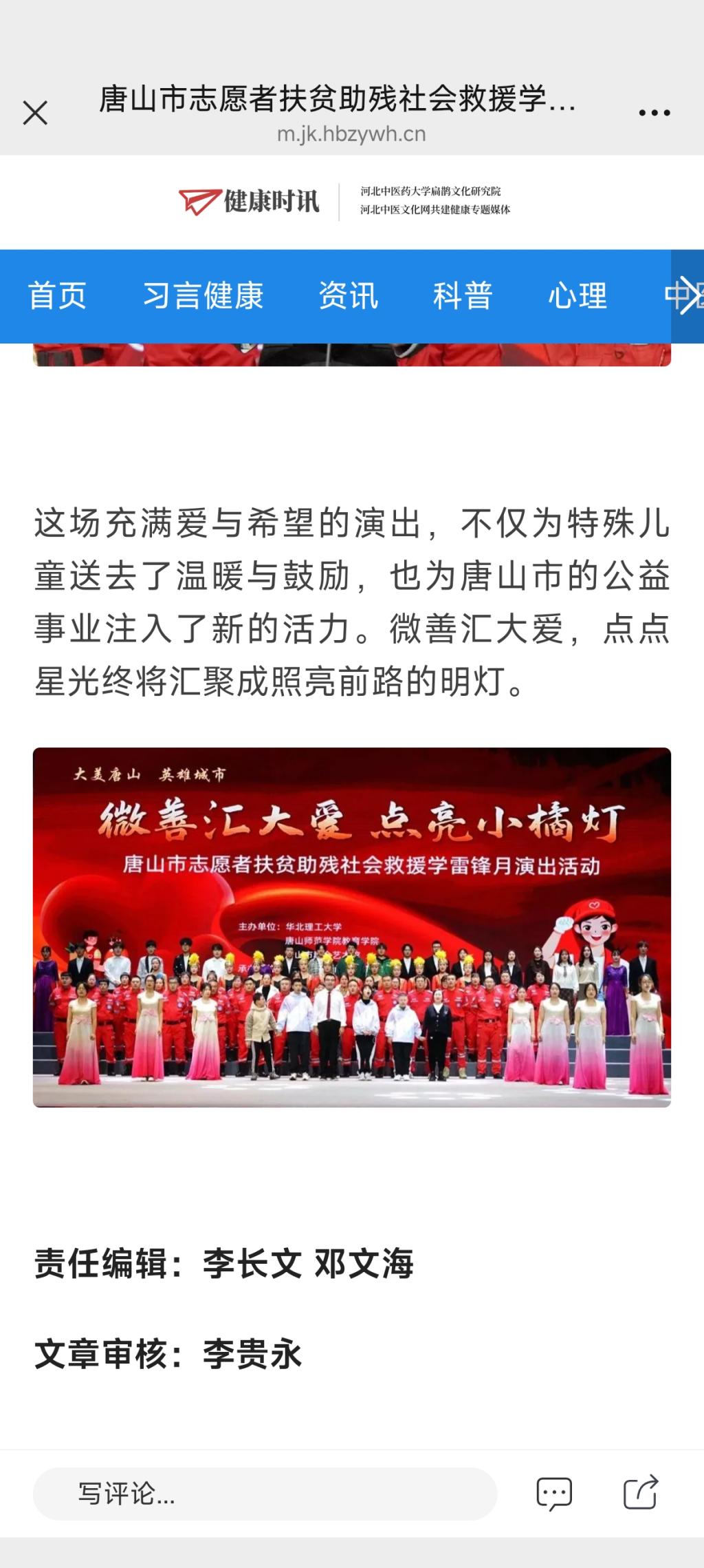 《健康时讯》—“微善汇大爱,点亮小橘灯”——唐山市志愿者扶贫助残社会救援学雷锋月演出温情上演