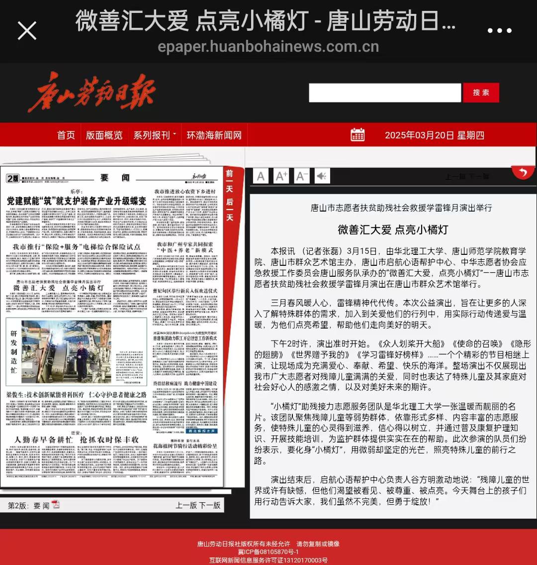 《唐山劳动日报》-唐山市志愿者扶贫助残社会救援学雷锋月演出举行