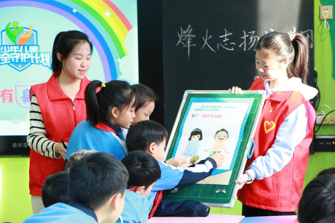 (在唐山市外国语实验小学,宣讲团成员李欣宜、侯士博给同学们带来预防侵害相关知识)