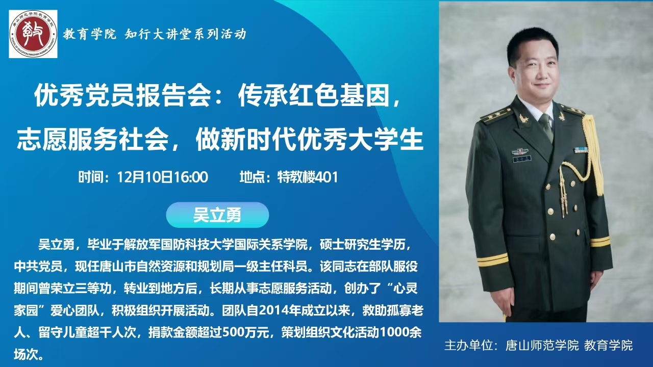 12月10日下午,吴立勇同志于tyc122cc太阳成特教楼401教室举行了主题为“英雄不寂寞,勇者竞风流”的知行大讲堂活动。