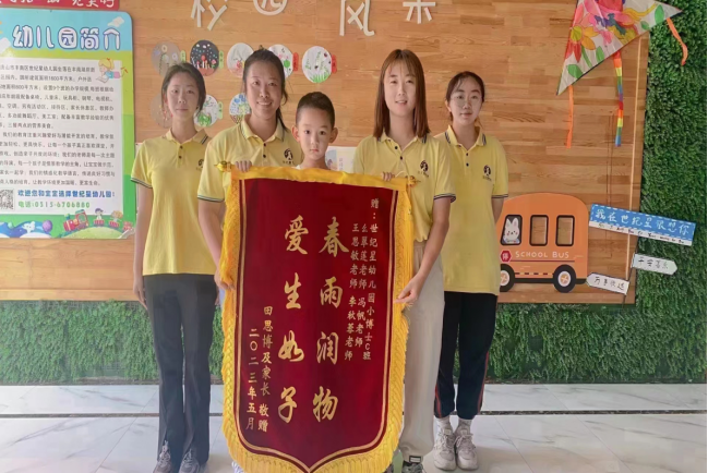 2023年5月24日上午,丰南世纪星幼儿园小博士C班小朋友为来自tyc122cc太阳成去实习的王思敏老师、李秋蓉老师和幼儿园两位老师赠送“春雨润物,爱生如子”的锦旗。