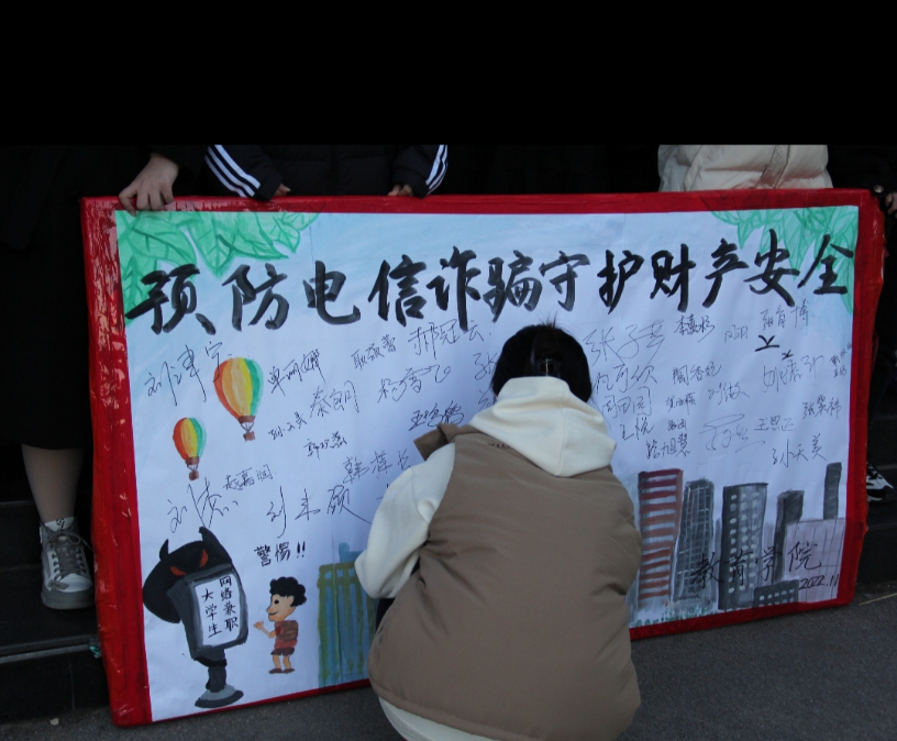 本次活动以预防网络电信诈骗为主题开展线下展板签名活动,活动重点围绕员工群体高发案件,如:在虚假游戏平台购买装备类诈骗、刷单返利类诈骗、虚假网络类贷款诈骗等。活动过程中刘建明书记率先在展板上签名并重点向同学们讲解了防诈骗中的九个“一律”,十个“凡是”,同时也针对性地提出了多种防范措施,加强了广老员工的警惕性,从而更好地维护同学们的财产安全以及合法权益。在活动的最后刘建明书记还积极倡导员工学习了解《中华人民共和国反电信网络诈骗法》,进一步巩固预防电信诈骗活动的宣传成果。