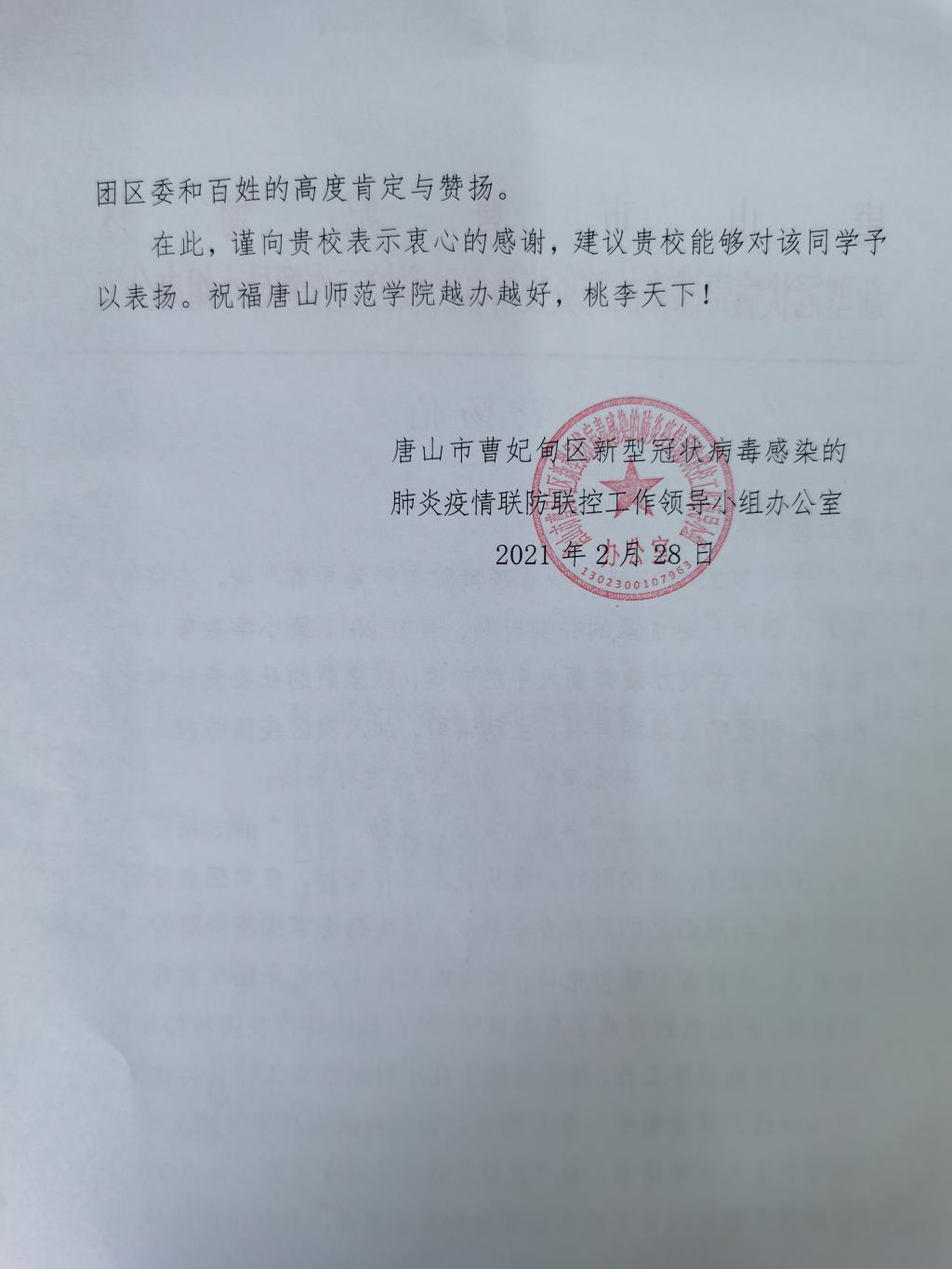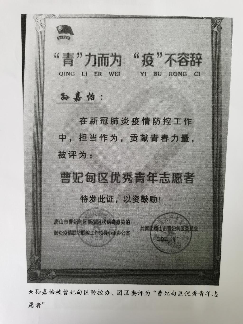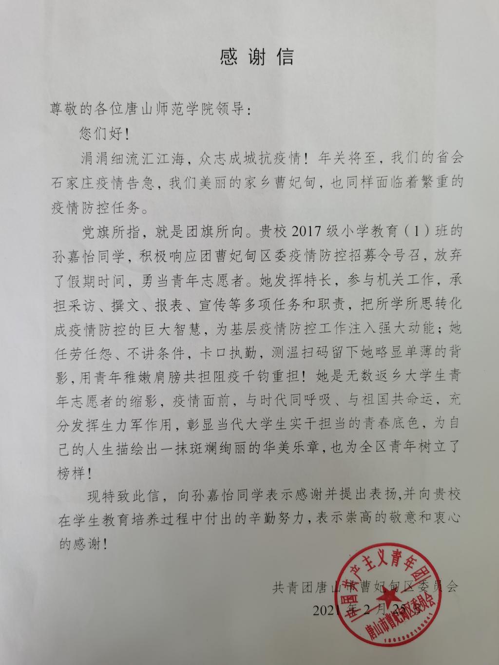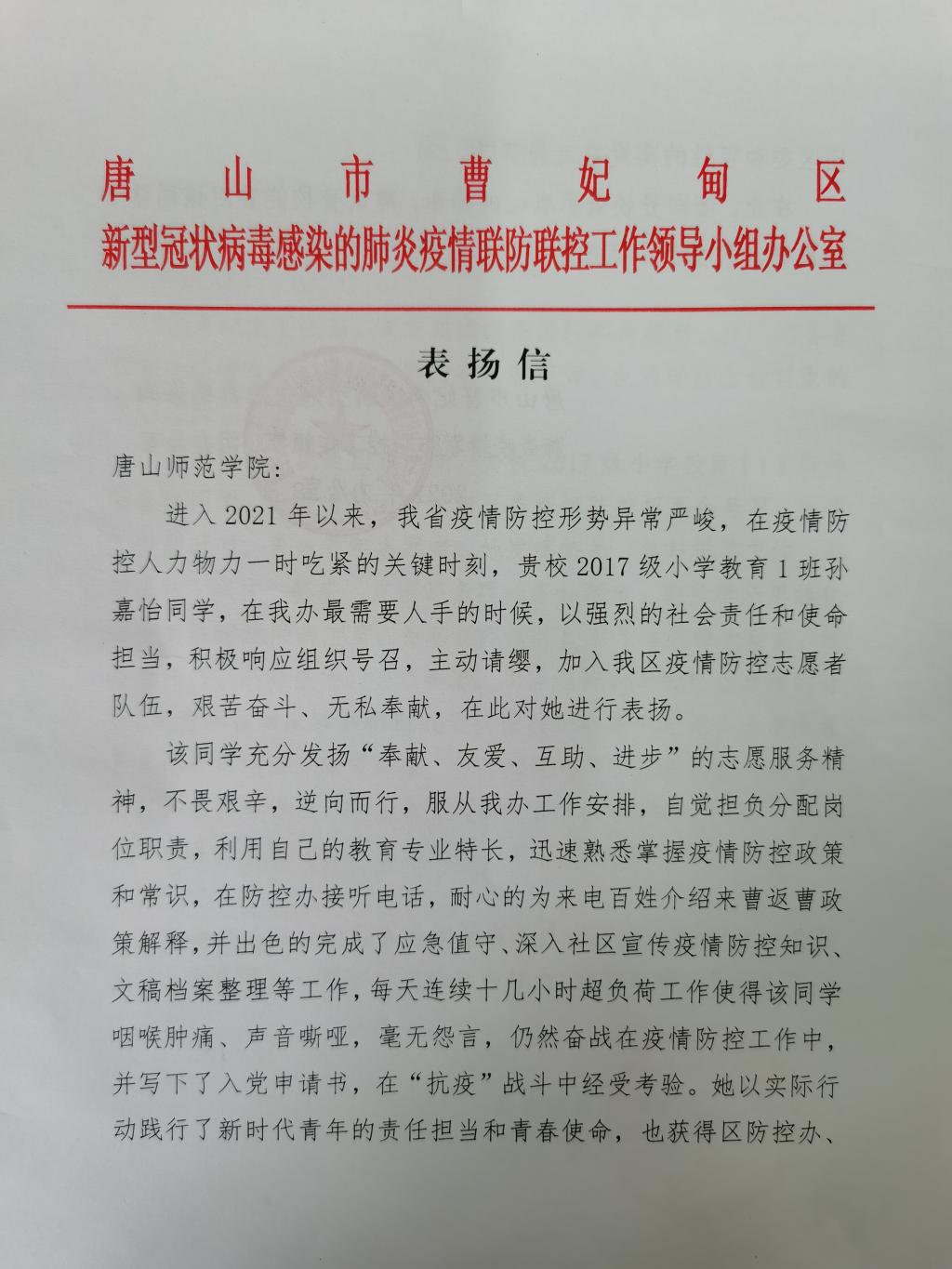 公司2017级小学教育本科1班员工孙嘉怡,积极响应团曹妃甸区委疫情防控招募令的号召,她发挥特长,参与机关工作,承担采访、撰文、报表、宣传等多项任务和职责,得到了唐山市曹妃甸区新型冠状病毒感染的肺炎疫情联防联控工作领导小组办公室和共青团唐山市曹妃甸区委员的感谢和表扬!