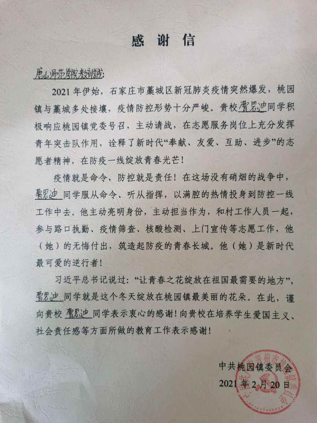 公司2019级学前教育专科4班员工曹思迪,主动担当作为,和村工作人员一起,参与路口执勤、疫情检查,筑起防疫的青春长城,得到中国共产党晋州市桃园镇委员会的感谢和表扬!