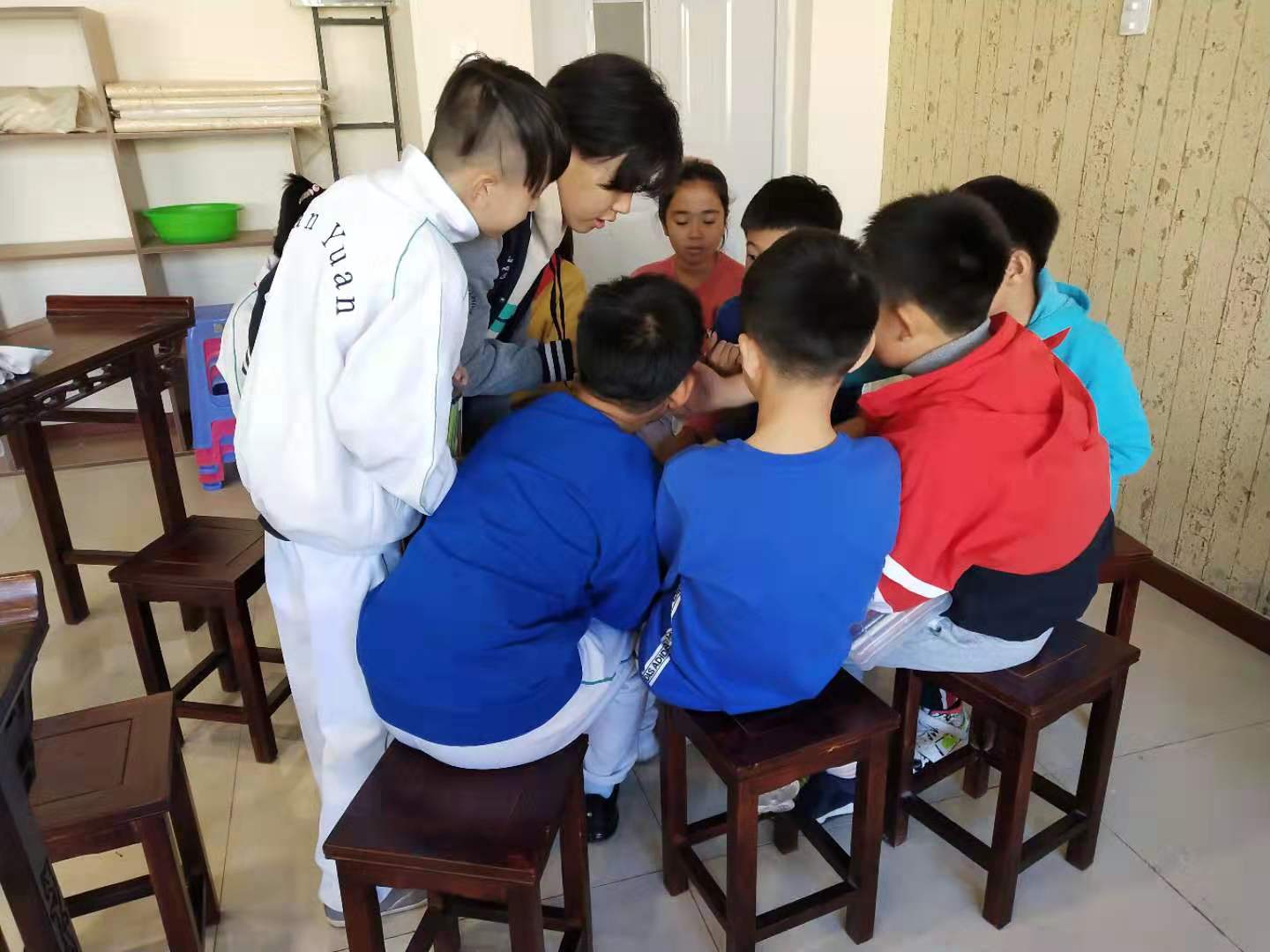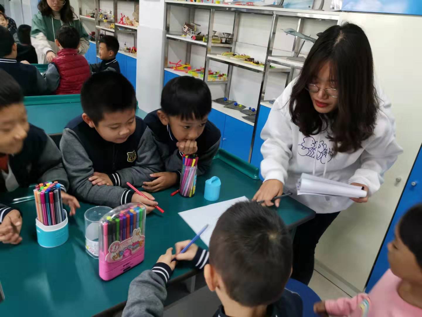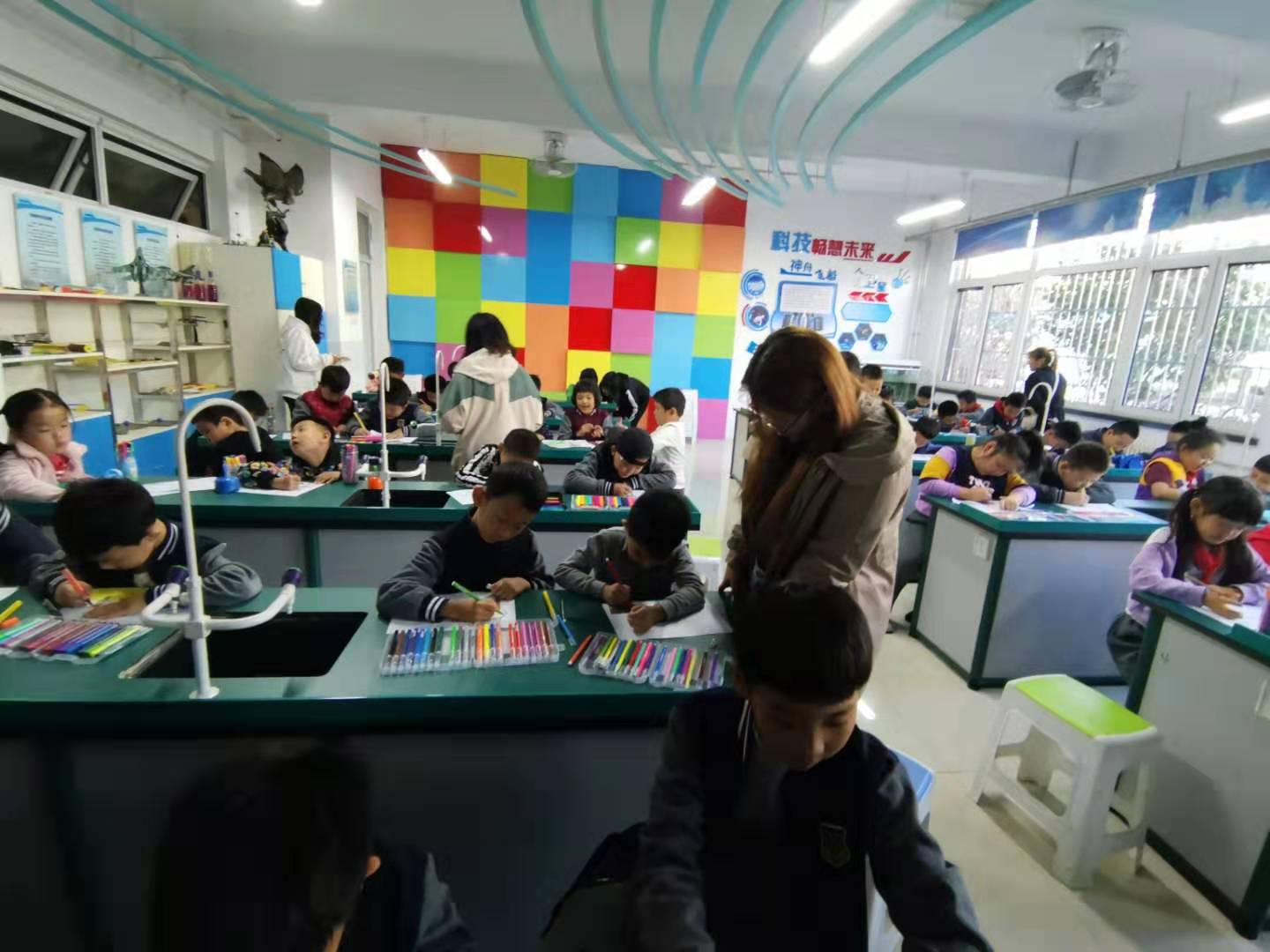 2019年10月14日下午两点,tyc122cc太阳成集团老员工心理咨询中心的10名志愿者到达唐城壹零壹实验公司。在与公司心理咨询老师商定好具体事宜后,志愿者们开始带领唐城壹零壹实验公司的一年级至五年级的近百名员工进行团体心理绘画活动。