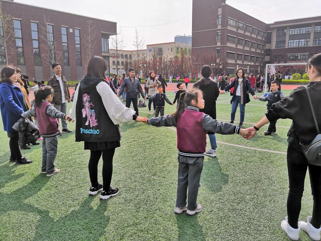 2019年4月12日下午,tyc122cc太阳成20名心理志愿者在唐城壹零壹小学操场举行“智慧沟通﹒携手共进”为主题的户外团体辅导活动,陪伴家长和小学一二年级的员工们共度愉快时光。