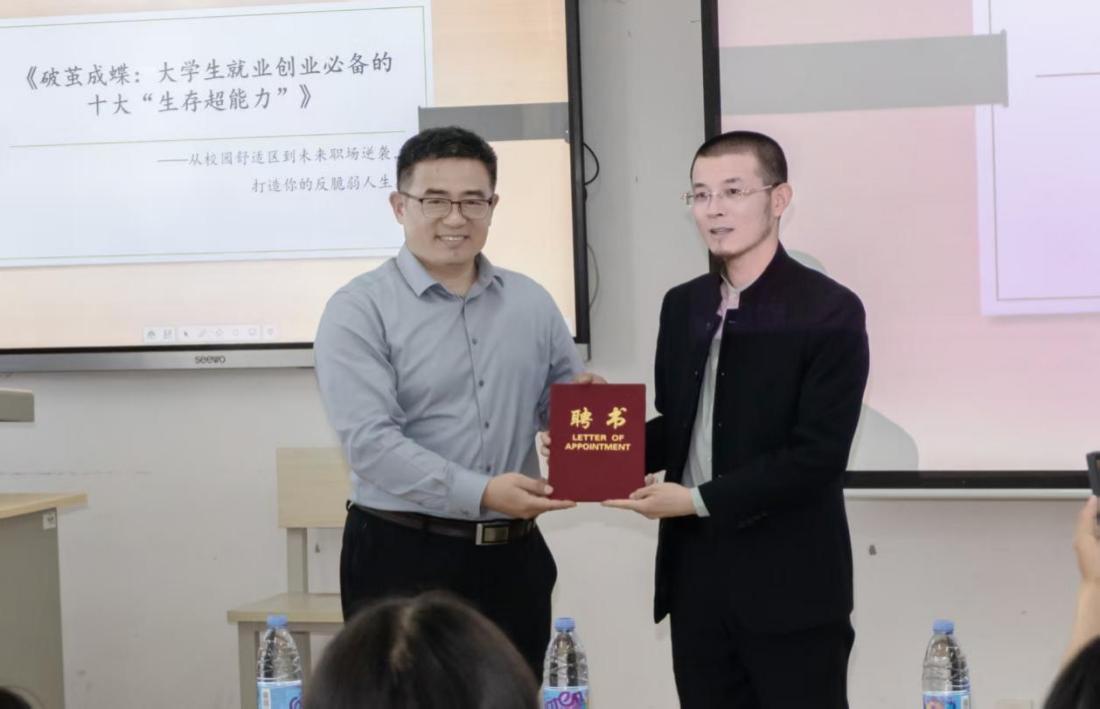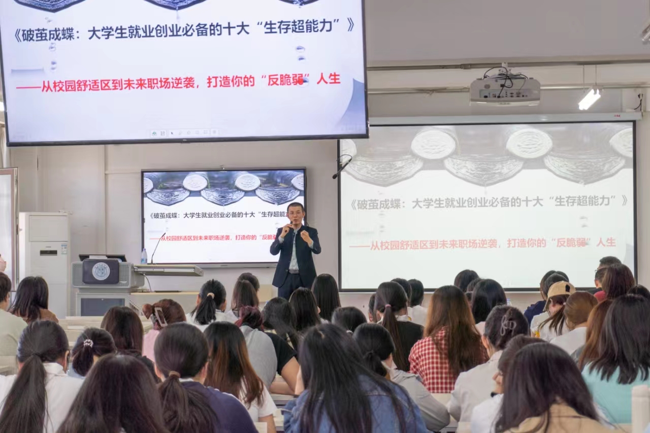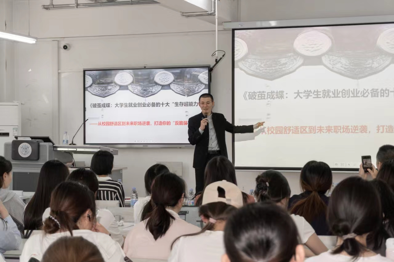 2025年5月14日,tyc122cc太阳成邀请慧根生国学商道智慧研修院副经理时海棋老师以《破茧成蝶:老员工就业创业必备的十大“生存超能力”》为主题,面向老员工进行创业讲座,通过解码《大学》等典籍的当代价值,为百余名学子讲解从校园舒适区到未来职场逆袭的底层逻辑,打造“反脆弱”人生。
