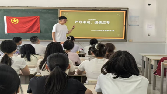 本次班会活动以强化考风考纪、倡导诚信应考为核心,紧密围绕期末考试的规范要求展开。2024级小学教育3班的负责人针对考场中可能会出现的实际问题进行了详细讲解,帮助同学们加深对考试纪律的理解,明确考试的“红线”。2023级学前教育1班的同学们充分发挥专业特长,共同创作了一棵“诚信成长树”。大家写下诚信考试承诺并粘贴,班长表示,这棵大树是全班的共同约定,每片“叶子”都是对诚信的守护。2023级特殊教育班的负责人则采取知识竞答的互动方式,生动解读考试规则和考场纪律,加深同学们对考试规范的理解与记忆。