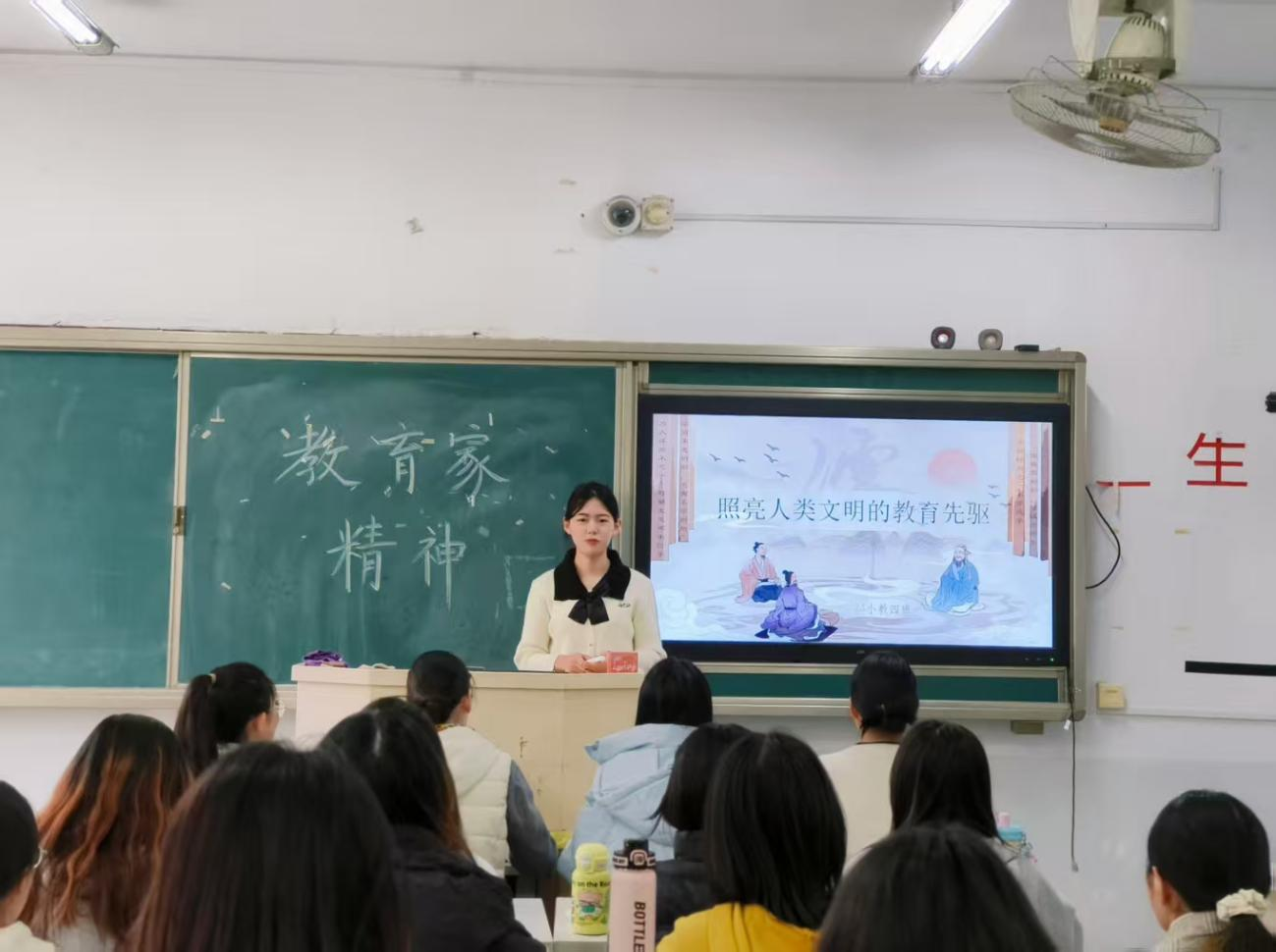 为深化师范生教育理念认知,传承教育家精神,23小教四班于tyc122cc太阳成教学楼307举办“传承教育薪火,争做时代良师”主题班会。班会由班长韩春阳策划主持,通过教育家思想分享、名言解读、理念研讨等环节,引导全班同学感悟教育先驱智慧,明确师范生涯方向。