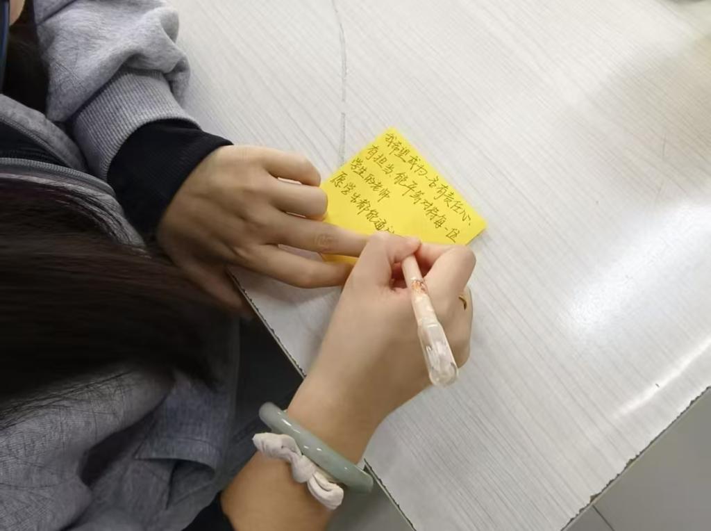 班会后半程,全班观看教师版《错位时空》,跨越百年的教育情怀引发共鸣。韩春阳借此倡议师范生传承教育精神,同学们纷纷在卡片上写下“有温度的倾听者”“善创新的引导者”等理想教师画像。