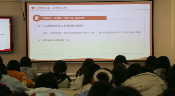 在本次宣讲活动中,志愿者们以认真倾听传递敬意,以交流探讨凝聚共识,让奉献的种子在青年心中生根发芽。宣讲现场,同学们有序落座,认真聆听政策解读与经验分享,主动交流疑问、记录要点,深入了解西部计划的岗位设置、政策保障与服务内容,在思想碰撞中明晰未来方向,在榜样故事里汲取奋进力量。大家收获的不仅是政策信息,更是对青年担当、责任奉献的深刻理解,对基层服务、青春建功的坚定向往。